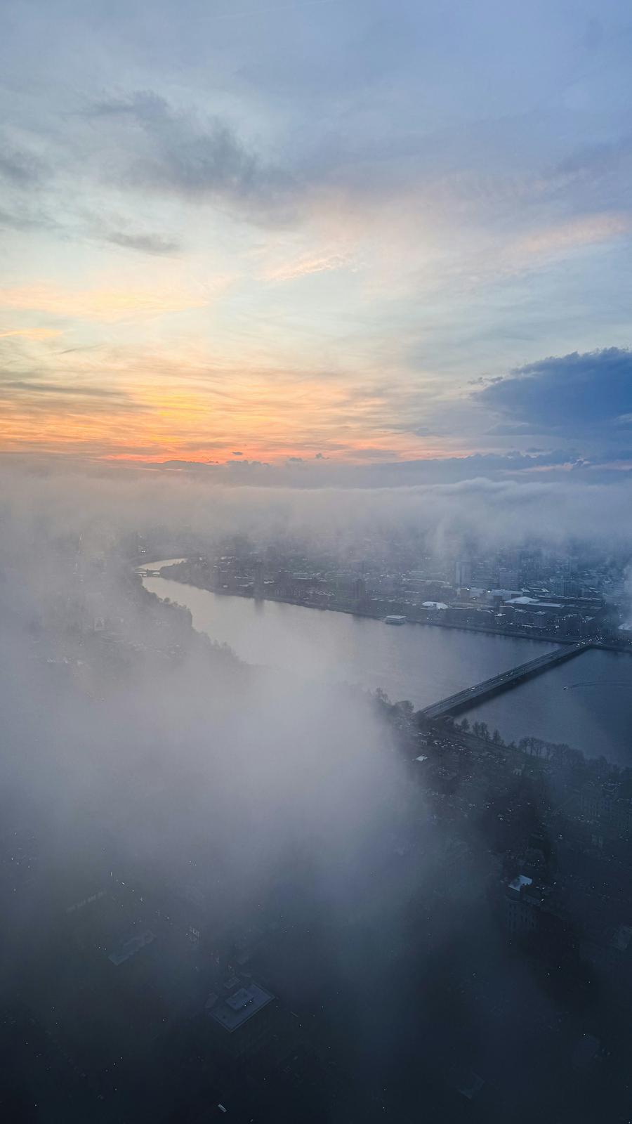 Cityscape Shrouded in Fog at Sunrise with River and Bridge